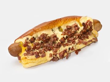 Salchicha Bockwurst XL, queso cheddar, relish de pepinillo, salsa 'Calle 7' y bacon bits en suave pan de Hot Dog 'potato roll'